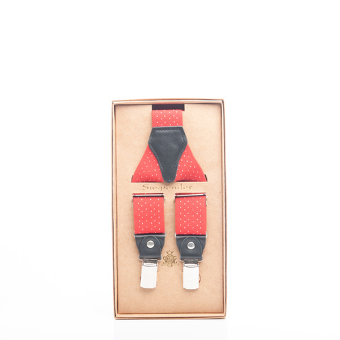 Bring a cheerful, classic touch to your look with our “Cherry Dot” Suspenders. These delightful Y-back suspenders feature a lively red base adorned with charming small white polka dots, reminiscent of vintage style with a playful twist. The dark grey/black leather tabs and Y-back patch provide a sophisticated contrast, while the polished silver-tone clips ensure durability.