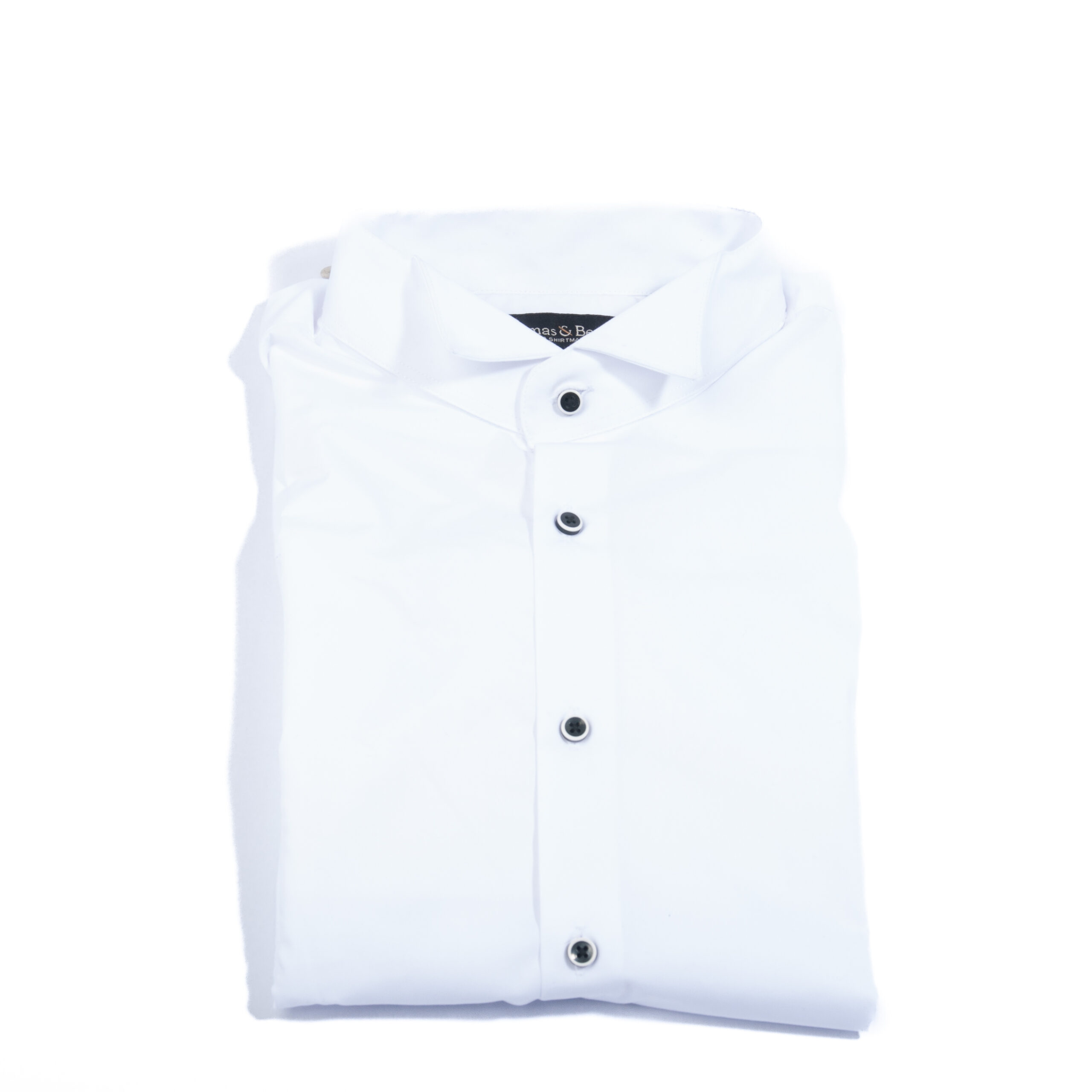 A classic white shirt elevated with striking black buttons for a modern, sophisticated edge. Perfect for making a subtle yet impactful statement.