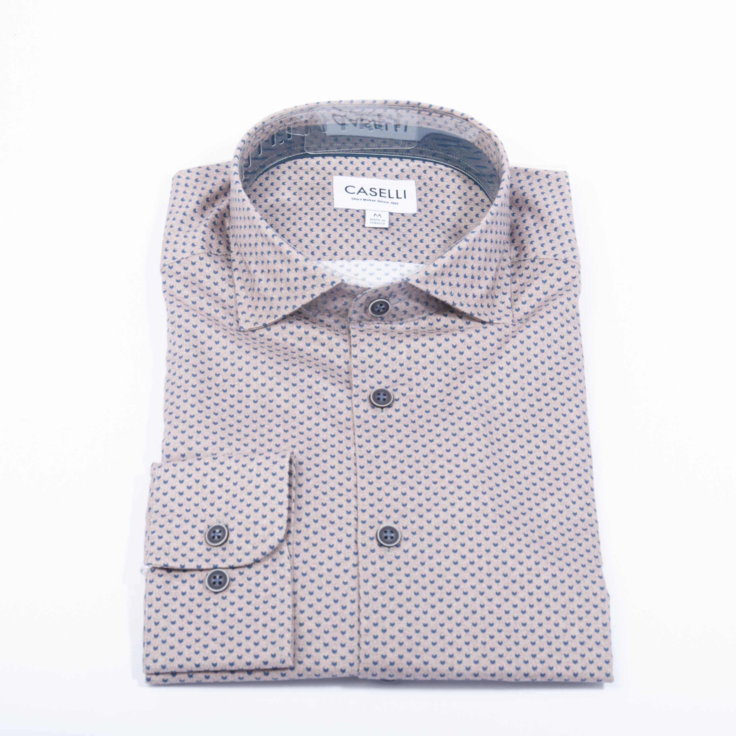 Refine your look with this subtly sophisticated shirt, featuring a charming micro-dot pattern. Tiny blue dots are elegantly dispersed across a soft beige background, creating a textured yet understated visual appeal.