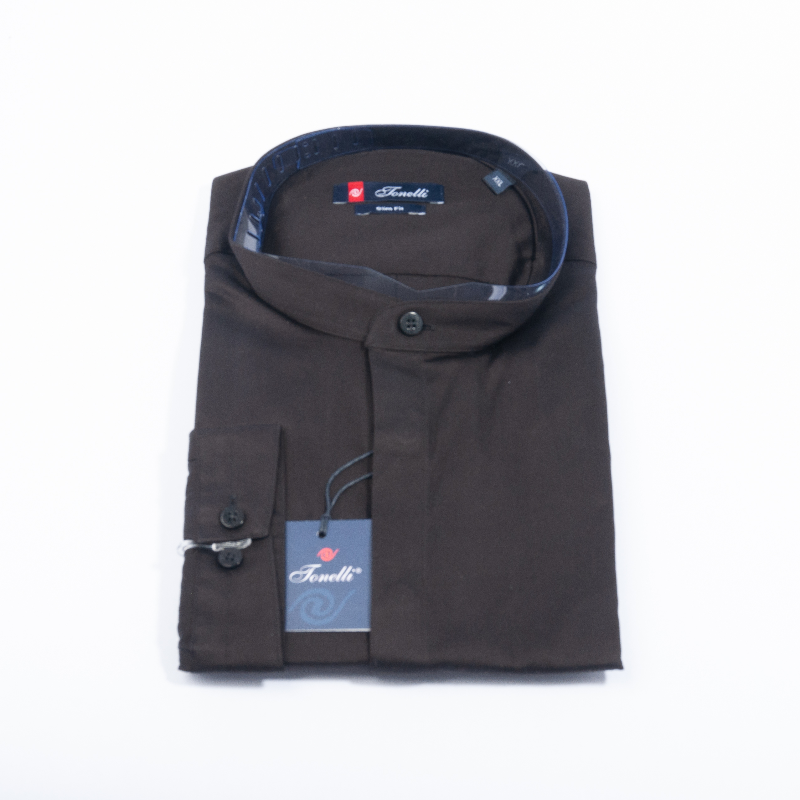 Embrace understated sophistication with this rich black slim-fit shirt, featuring a stylish band collar that offers a sleek and contemporary alternative to traditional necklines.